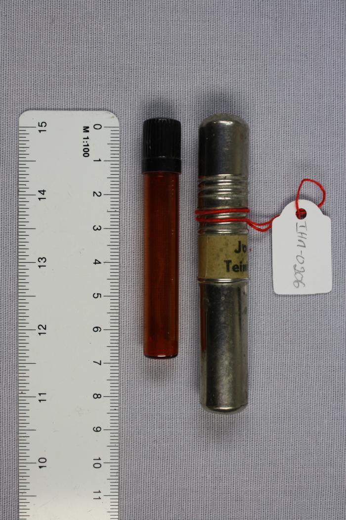 Flacon en verre dans boîte en métal. Etiquette “Jodtinktur. Teinture d’iode”.