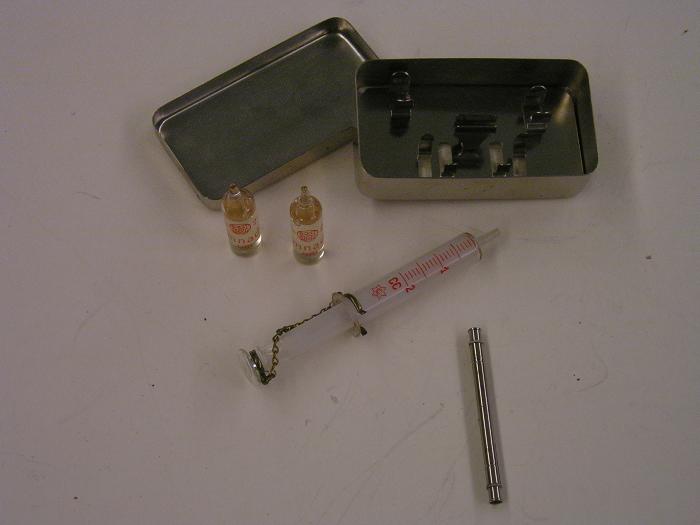 Seringue de verre de 2 ml, marquée “Omnadine” avec chaînette pour retenir le piston et une aiguille dans étui métal.
